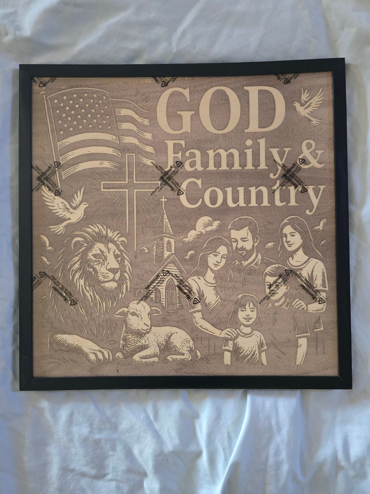 Celebrate the timeless values of faith, family, and patriotism with this beautifully crafted 16×16 laser-engraved basswood wall art. This powerful design features the words “God, Family & Country” surrounded by meaningful symbols including the American flag, a shining cross, a church steeple, peaceful doves, a loving family, and the iconic lion and lamb representing strength, peace, and faith.