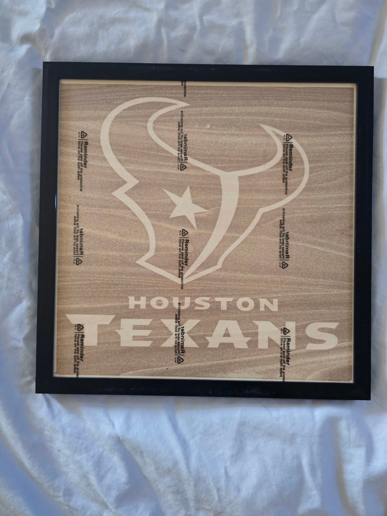 Crafted on natural wood, the engraving highlights sharp contrast and smooth grain patterns, giving the design a timeless, rugged feel. The sleek black frame adds a modern edge, making it perfect for game rooms, man caves, offices, or anywhere you want to represent Houston football.